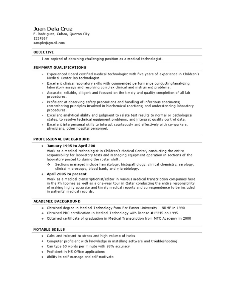 Medical Technologist Resume Clean And Concise Health Care